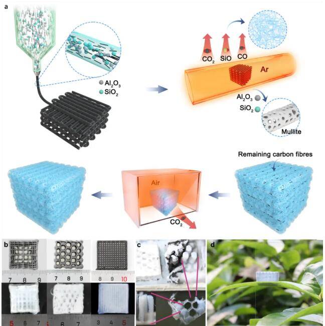 圖2. MR-SiC AC的DIW過程。(a) 制備3D 打印MR-SiC AC 的流程圖。(b) 不同印刷孔形狀樣品燒結前后的照片。第一列顯示使用 Cf/SiO2墨水打印的樣品,另外兩列顯示使用 Al2O3/Cf/SiO2墨水打印的樣品。(c) 樣品組織的宏觀分布。(d) 密度為 0.15 g/cm3的3D打印MR-SiC AC樣品平衡于一片葉子上的照片。