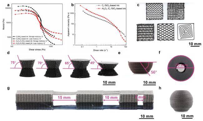 圖1. Al2O3/Cf/SiO2墨水性能演示。Al2O3/Cf/SiO2油墨的流變行為:(a) 儲能模量 (G’) 和損耗模量 (G”) 作為剪切應力的函數(shù);(b) 粘度作為剪切速率的函數(shù)。(c)-(h) 具有復雜形狀的打印樣品展示。