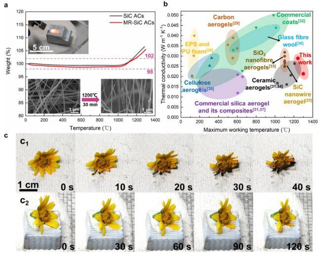 圖4. SiC ACs和MR-SiC ACs的熱性能。(a) 表明熱氧化穩(wěn)定性的 TGA 曲線。左上方插圖為影片截圖,顯示了樣品的耐火特性。下方的插圖顯示了納米線在1200 °C燒結30分鐘前后的形貌變化。(b) 熱導率與隔熱材料最高工作溫度的關系。(c) 一朵鮮花放在燃燒酒精火焰的石棉網(wǎng)上,在沒有(c1)和有MR-SiC AC(c2)的情況下,其形態(tài)隨時間發(fā)生變化的照片。