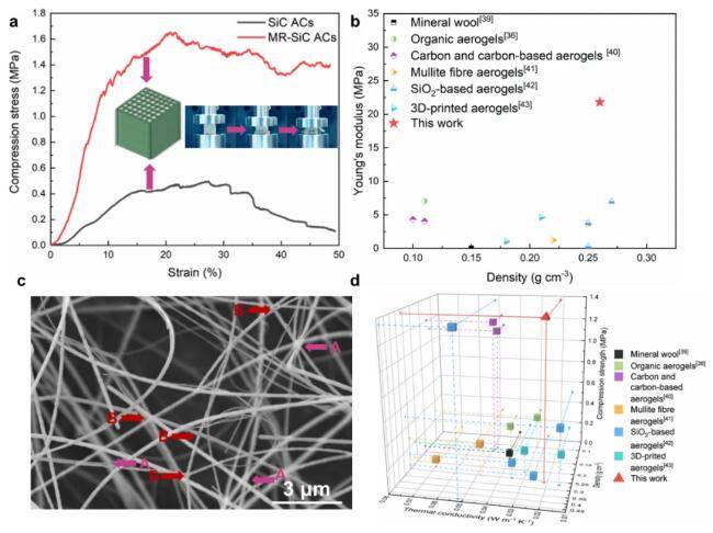 圖5. SiC ACs和MR-SiC ACs的力學性能。(a) SiC AC和MR-SiC AC在壓縮實驗中的應力-應變曲線。(b) 熱絕緣材料的楊氏模量與密度的關系。(c) SEM圖像顯示納米線成束集結的A區(qū)和重疊交叉的B區(qū)。(d) 熱絕緣材料的熱導率與密度和強度的三維圖。