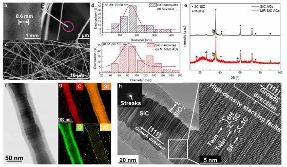 圖3. MR-SiC AC的形態(tài)結構表征。(a) 燒結后打印骨架和孔的SEM圖像。(b) 納米線尖端。(c) SEM圖像顯示納米線具有粗糙的表面。(d) SiC AC (SiC aerogel composite) 和MR-SiC AC中SiC納米線的平均直徑分布。(e) SiC AC和MR-SiC AC的XRD結果。MR-SiC AC上單根SiC納米線的TEM表征:(f)、(g) 明場像和相應的TEM-EDS結果;(h) TEM圖像和對應的電子衍射圖(插圖);(i) 對應的HRTEM圖像。