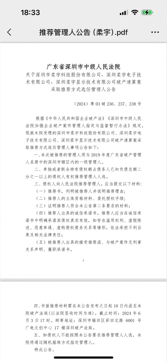 眼下柔宇正處緊要關(guān)頭。據(jù)天眼查,深圳市中級人民法院5月24日已發(fā)布了柔宇破產(chǎn)清算案采取推薦方式選任管理人的公告。管理人推薦的截止時間是2024年6月3日17時,如債權(quán)人不能按要求推薦管理人,法院將通過隨機搖珠方式指定管理人。