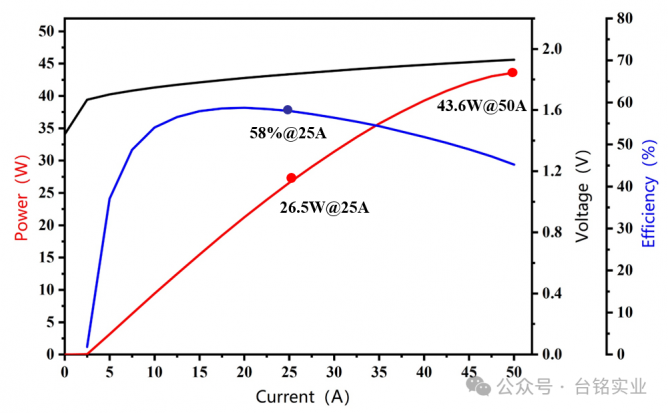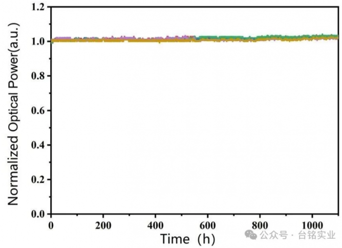 根據(jù)測(cè)試,采用臺(tái)銘光電808nm-25W高功率激光芯片封裝的COS,最大輸出功率超過(guò)43W,在CW25A下輸出功率26.5W,電光轉(zhuǎn)換效率58%。該芯片在室溫25A下可長(zhǎng)期保持功率持續(xù)穩(wěn)定輸出,充分展現(xiàn)了其高可靠性。