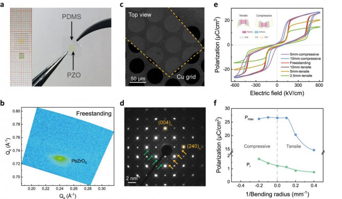 自支撐PbZrO3單晶薄膜的制備 (a) 將2.5mm × 2.5mm的PbZrO3薄膜轉(zhuǎn)移至PDMS上的光學(xué)圖像;(b)自支撐PbZrO3薄膜的(103)倒易空間圖;(c)銅網(wǎng)上自支撐PbZrO薄膜的透射電子顯微鏡俯視圖;(d)自支撐PbZrO3薄膜的選區(qū)電子衍射圖;(e)自支撐PbZrO3薄膜不同彎曲狀態(tài)下的電滯回線,插圖為其彎曲測試示意圖;(f)最大極化(Pmax)和剩余極化(Pr)隨彎曲半徑的變化規(guī)律