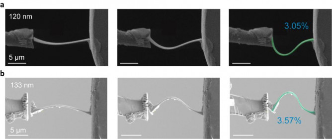 圖2 自支撐PbZrO3薄膜的原位掃描電子顯微鏡彎曲試驗(yàn) (a)120nm厚PbZrO3的彎曲試驗(yàn);(b)133nm厚PbZrO3的彎曲試驗(yàn)