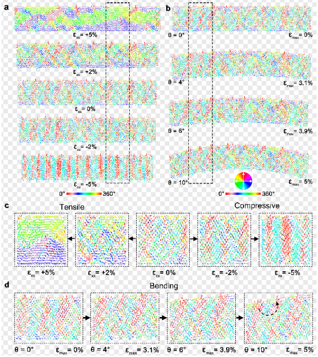 自支撐PbZrO3單晶薄膜不同應(yīng)變狀態(tài)下疇結(jié)構(gòu)演化的原子模擬結(jié)果 (a)單軸拉伸和壓縮應(yīng)變εxx下偶極子構(gòu)型的演變圖;(b)彎曲過程中偶極子構(gòu)型的演變圖,其中εmax和θ分別為PbZrO3薄膜的最大彎曲應(yīng)變和彎曲角度;(c)圖(a)虛線框中單軸拉伸和壓縮應(yīng)變下偶極子構(gòu)型的放大圖;(d)圖(b)虛線框中彎曲應(yīng)變下偶極子構(gòu)型的放大圖