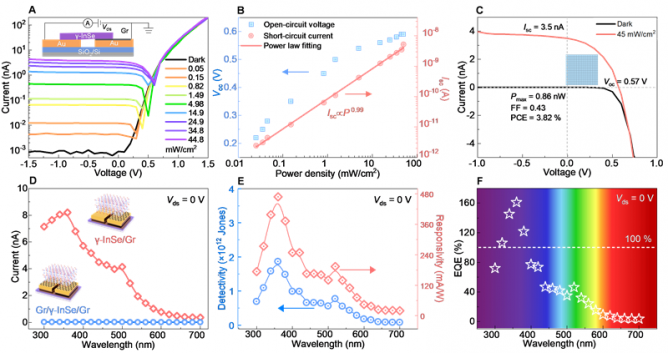 本文研究團(tuán)隊(duì)成功構(gòu)建了一種自驅(qū)動(dòng)紫外γ-InSe/Gr光電探測(cè)器,不僅實(shí)現(xiàn)了高效的載流子倍增(CM)效應(yīng),而且在360 nm的光照下,獲得了468 mA/W超高響應(yīng)度和創(chuàng)紀(jì)錄的161%外量子效率。該工作為構(gòu)建新一代高性能、低功耗的紫外光電探測(cè)器提供了新的思路和一種可行的方案。
