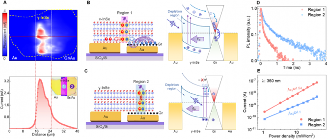 通過變光功率密度I-V測(cè)試以及短路電流與光功率密度的冪律擬合(圖2a-c),證實(shí)該探測(cè)器展現(xiàn)出了優(yōu)異的自驅(qū)動(dòng)性能,并且具備高效的光生載流子分離能力。其高達(dá)0.57 V的開路電壓,充分證明了內(nèi)部構(gòu)建了強(qiáng)大的內(nèi)建電場(chǎng)。相較于沒有內(nèi)建電場(chǎng)的Gr/γ-InSe/Gr探測(cè)器,該探測(cè)器在短波長(zhǎng),尤其是紫外光波段,展現(xiàn)出的增強(qiáng)光電流(圖2d)。特別是在360 nm波長(zhǎng)的激發(fā)下,γ-InSe/Gr器件展現(xiàn)出了高達(dá)468 mA/W的超高響應(yīng)率和161.2%的EQE(圖2f)。通過零偏壓下的光電流掃描圖證實(shí)了“理想紫外光吸收層”與“強(qiáng)內(nèi)建電場(chǎng)”協(xié)同完成CM效應(yīng)的工作機(jī)理(圖3a)。在紫外光照射下,內(nèi)建電場(chǎng)可以有效地分離耗盡區(qū)產(chǎn)生的高能電子-空穴對(duì),隨后驅(qū)動(dòng)高能電子向Gr轉(zhuǎn)移,進(jìn)而實(shí)現(xiàn)高效的CM過程(圖3b)。隨著光照位置遠(yuǎn)離肖特基結(jié)界面區(qū)域(即遠(yuǎn)離耗盡區(qū)域,區(qū)域2),相應(yīng)的內(nèi)建電場(chǎng)逐漸減弱,甚至可能完全消失。此時(shí),即使在相同的紫外吸收下,光生的高能電子-空穴對(duì)卻無法有效分離并轉(zhuǎn)移到Gr,從而大大限制了CM過程(圖3c)。時(shí)間分辨熒光光譜、激發(fā)光功率與短路電流冪律擬合(α>1)以及隨激發(fā)光子能量線性增加的內(nèi)量子效率等結(jié)果實(shí)驗(yàn)驗(yàn)證了高能載流子的有效分離、轉(zhuǎn)移以及CM過程。