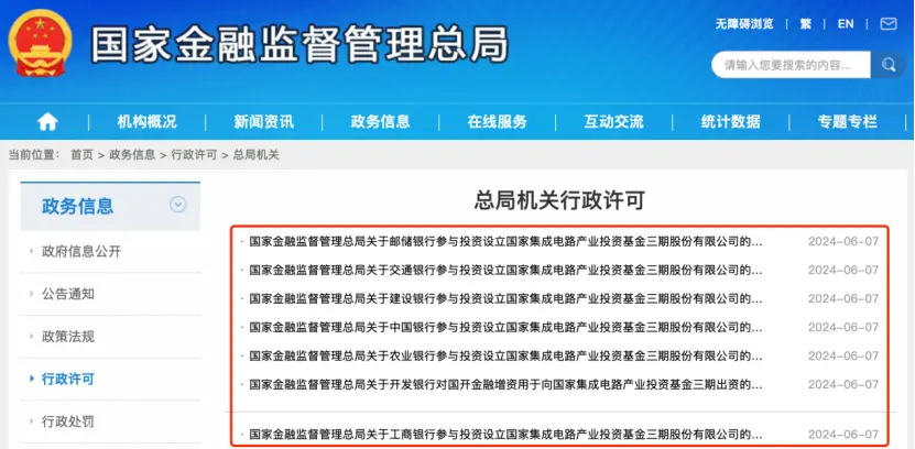 6月7日,國(guó)家金融監(jiān)管總局官網(wǎng)掛出同意國(guó)有六大行參與投資設(shè)立國(guó)家集成電路產(chǎn)業(yè)投資基金三期股份有限公司的行政批復(fù)。