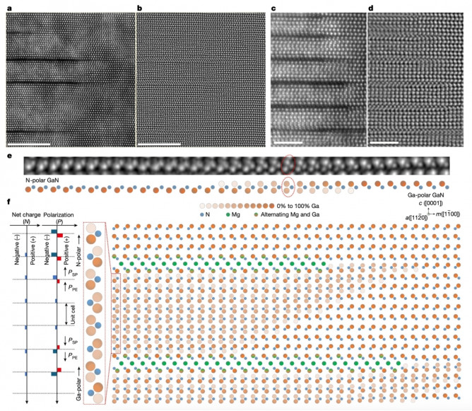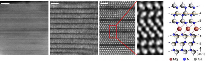 圖1. 2D-Mg嵌入GaN式超晶格(MiGs)的微觀結(jié)構(gòu)照片和原子示意圖。@nature