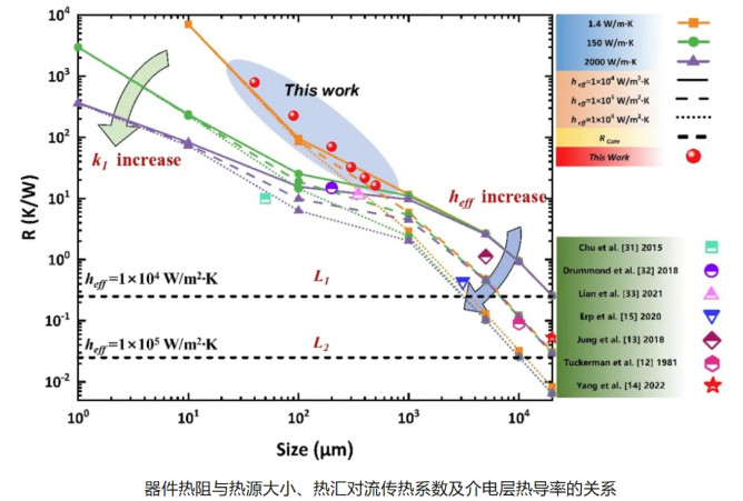 經(jīng)過實測,該微通道散熱器針對500 × 500 μm2熱源的散熱熱流密度達到1200 W/cm2以上,平均溫升小于60 ℃,對流換熱系數(shù)達到1.5×105 W/(m2?K)。此外,該工作還基于實驗數(shù)據(jù)構(gòu)建了熱流耦合仿真與理論模型,系統(tǒng)總結(jié)了在多場景下電子器件典型結(jié)構(gòu)中的熱匯熱阻、一維傳導(dǎo)熱阻和擴散熱阻的變化規(guī)律。研究發(fā)現(xiàn),在基底尺寸固定的情況下,熱點的尺寸從小到大的變化會導(dǎo)致器件中的主要熱阻從擴散熱阻轉(zhuǎn)變至熱匯熱阻,因此針對點熱源和面熱源需要根據(jù)其主要熱阻的轉(zhuǎn)變趨勢采用不同的散熱手段。