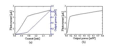 圖3 (a)集成PD可調(diào)諧MEMS-VCSEL的光功率-電流-集成PD光電流曲線;(b)集成PD光電流-光功率曲線