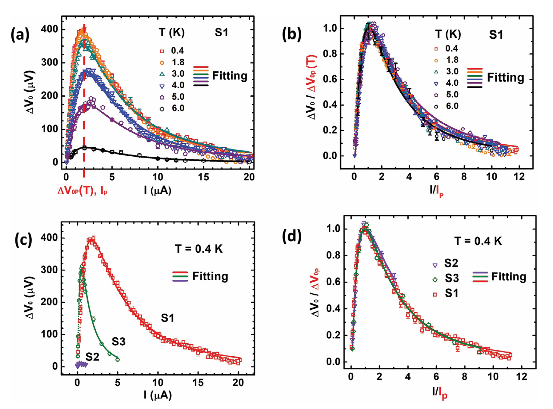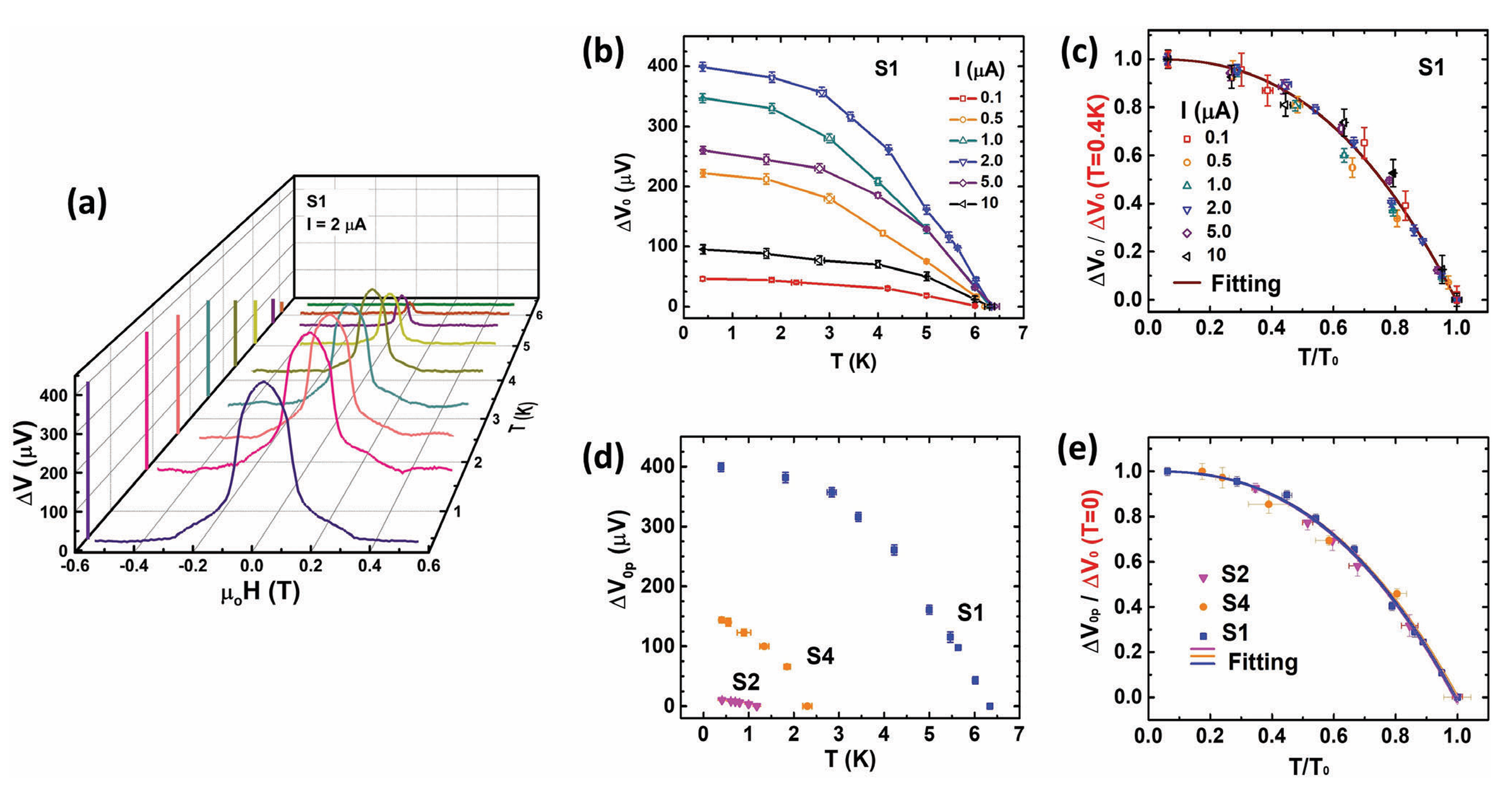 圖2 Hanle峰值信號的普適偏置電流依賴關(guān)系。器件S1在不同溫度下 (a) Hanle峰值信號隨偏置電流的變化曲線; (b) 歸一化Hanle峰值信號的偏置電流依賴曲線。溫度為0.4 K時三個不同器件的 (c) Hanle峰值信號隨偏置電流的變化曲線; (d) 歸一化Hanle峰值信號的偏置電流依賴曲線