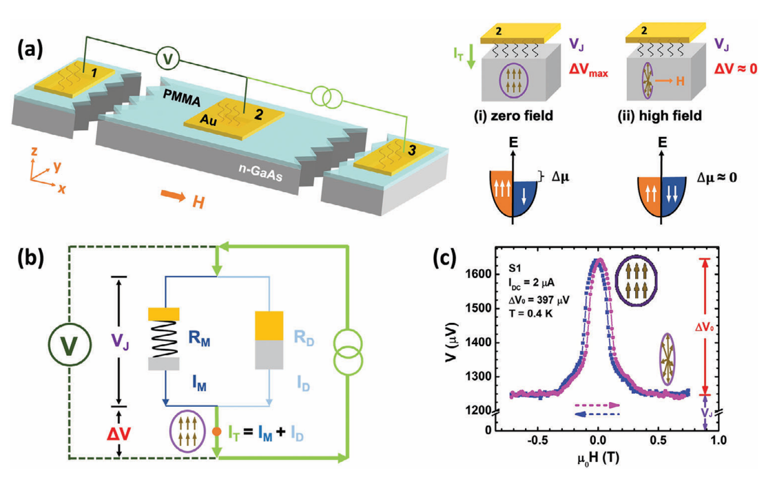 圖1 (a) 橫向自旋電子器件的結(jié)構(gòu)示意圖及原理示意圖; (b) 橫向自旋電子器件的等效電路圖; (c) 實驗測得的典型Hanle信號
