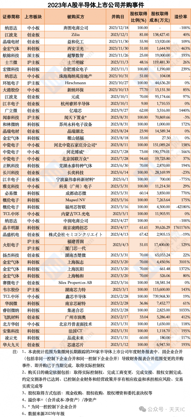 值得一提的是,2023年實施并購的上市公司中,科創(chuàng)板企業(yè)占比33.3%,大幅低于所有半導體上市公司中科創(chuàng)板企業(yè)占比(53.5%)。此前,半導體上市公司實施并購項目的企業(yè)中,科創(chuàng)板上市企業(yè)并不活躍,隨著“科創(chuàng)板八條”等一系列政策落地,科創(chuàng)板企業(yè)將加速半導體行業(yè)新一輪的并購潮。