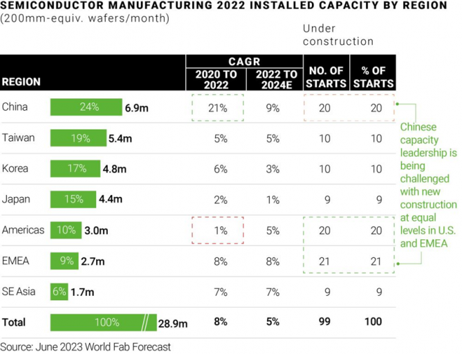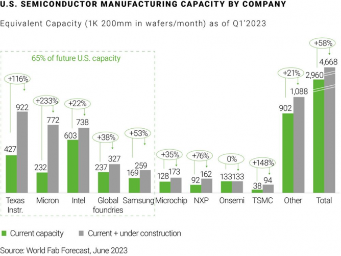 在新建設(shè)施數(shù)量方面,美國(guó)與中國(guó)的競(jìng)爭(zhēng)日益激烈。美光、三星、英特爾、臺(tái)積電和德州儀器宣布在美國(guó)新建大型制造設(shè)施完工后,國(guó)內(nèi)制造能力將增加近 60%(圖 1)。全面投入運(yùn)營(yíng) 后,這些工廠的總產(chǎn)量將使美國(guó)與臺(tái)灣和韓國(guó)的產(chǎn)量持平(圖 2)。