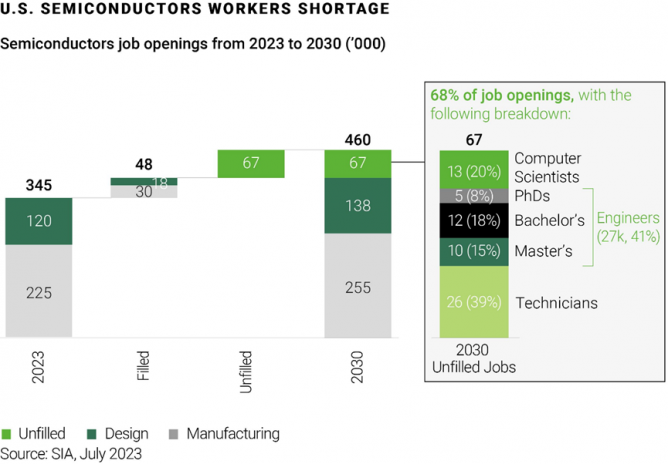 盡管美國(guó)在國(guó)內(nèi)制造業(yè)和技術(shù)方面投入了大量資金,但其有效性最終將取決于是否有技術(shù)熟練、能力強(qiáng)的勞動(dòng)力——而美國(guó)尚未做好準(zhǔn)備。由于經(jīng)濟(jì)形勢(shì)復(fù)雜,就業(yè)市場(chǎng)緊張,許多行業(yè)已經(jīng)陷入勞動(dòng)力短缺的困境。根據(jù) AlixPartners 的分析,員工缺口將非常大,因?yàn)榧夹g(shù)熟練的工程師、技術(shù)人員和科學(xué)家實(shí)在是太少了。除此之外,該行業(yè)還需要大量招聘員工,以滿足不斷增加的制造任務(wù),如運(yùn)行生產(chǎn)線、測(cè)試、包裝和運(yùn)輸產(chǎn)品。即使到新制造設(shè)施投入使用時(shí)工人的生產(chǎn)率有所提高,公司也可能需要填補(bǔ)相當(dāng)于 6.7 萬(wàn)名全職員工的缺口,以滿足投資需求(圖 3)。