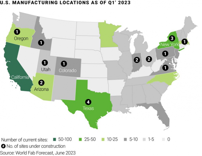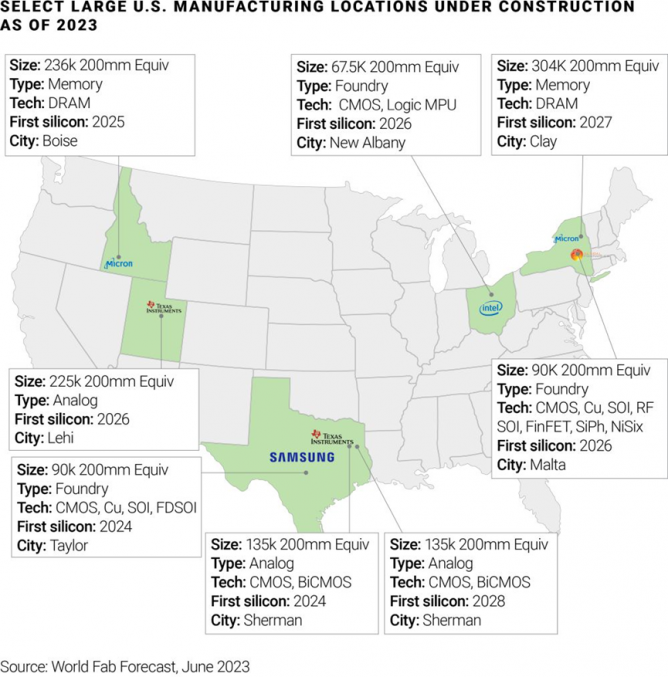使問(wèn)題更加嚴(yán)重的是,新工廠在地理上遠(yuǎn)離歷史人才中心。按制造數(shù)量計(jì)算,加利福尼亞州擁有最大的制造基地,但新工廠數(shù)量為零(圖 4)。山區(qū)西部和中大西洋地區(qū)目前是相對(duì)較小的地區(qū)參與者,但很快將成為世界上最先進(jìn)的芯片生產(chǎn)設(shè)施的所在地。受低成本能源、便利的房地產(chǎn)以及州和地方激勵(lì)措施的吸引,美光和英特爾等公司正在新奧爾巴尼(俄亥俄州中部)、克萊(紐約州北部)和萊希(鹽湖城郊區(qū))等社區(qū)建造大型設(shè)施(圖 5)。