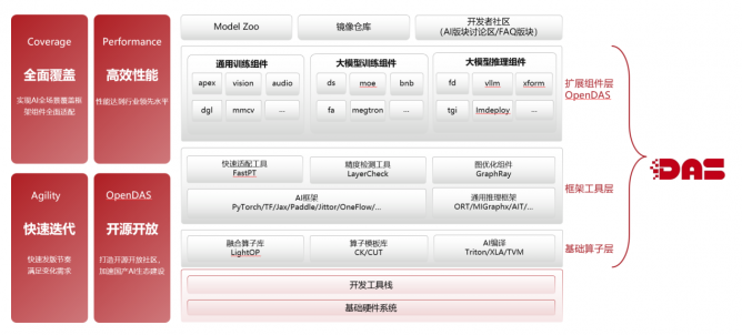 不僅如此,今年初中科曙光還推出了人工智能基礎(chǔ)軟件系統(tǒng)DAS,可提供AI全棧優(yōu)化能力。該系統(tǒng)對(duì)AI全場景的框架組件進(jìn)行了全面適配和性能優(yōu)化,并通過開源社區(qū)向廣大開發(fā)者和用戶開放,幫助客戶更高效快速地實(shí)現(xiàn)AI軟件遷移與應(yīng)用落地。