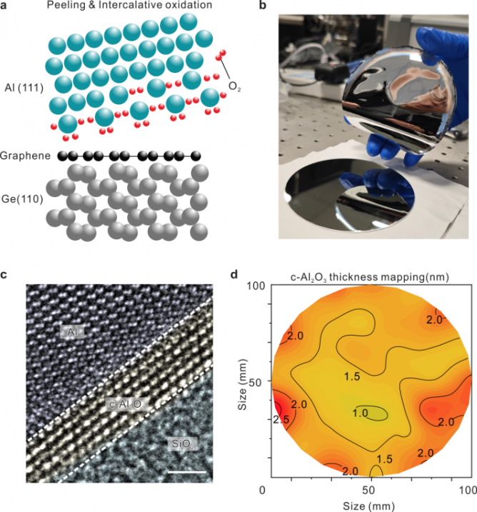 圖1.藍(lán)寶石單晶(c-Al2O3)柵介質(zhì)薄膜。a,單晶Al(111)插層氧化形成c-Al2O3示意圖。極低氧含量條件下,氧原子逐層進(jìn)入Al(111)晶格中;b, 4寸單晶Al(111)晶圓。c,單晶Al(111)/c-Al2O3在SiO2襯底上的截面HRTEM圖像。標(biāo)尺:1nm;d,c-Al2O3晶圓厚度分布圖。