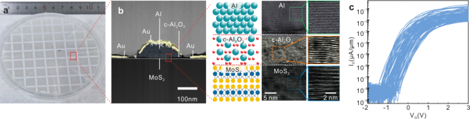 圖2. 基于c-Al2O3 柵介質(zhì)的二維MoS2晶體管。a, 4英寸二維c-Al2O3/MoS2晶體管陣列;b, c-Al2O3/MoS2晶體管器件截面TEM圖;c,c-Al2O3/MoS2晶體管器件轉(zhuǎn)移特性曲線。