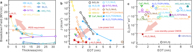 圖3. 基于c-Al2O3 柵介質(zhì)的二維MoS2晶體管性能。a,擊穿場(chǎng)強(qiáng);b,泄漏電流;c,界面態(tài)密度。