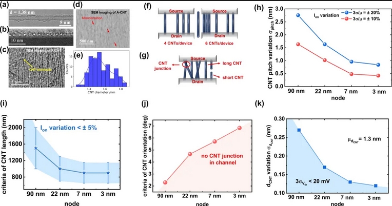 近日,北京大學電子學院、碳基電子學研究中心張志勇教授課題組與浙江大學材料科學與工程學院金傳洪教授課題組合作,從高性能電子器件和集成電路角度,對A-CNT材料進行深入研究與系統(tǒng)分析,提出了精細的要求和標準。通過實驗結果結合理論計算,團隊對90 nm、22 nm、7 nm、3 nm技術節(jié)點的A-CNT FET的電學性能進行預測,并基于未來集成電路對晶體管性能的要求,提出對陣列碳納米管密度的要求(圖1 a)。研究結果表明,相同節(jié)點下,A-CNT CMOS器件相比于硅基CMOS器件展現出4-6倍的能量延時積(EDP)優(yōu)勢(圖1 b),凸顯了其在未來高性能數字集成電路中的應用潛力。團隊進一步對目前A-CNT中存在的形貌缺陷進行表征(圖2 a-e),討論各形貌缺陷對晶體管電學性能波動的影響,并結合集成電路對器件均一性的要求,對碳管形貌提出要求(圖2 f-k)。在此基礎上,提出了電子級A-CNT材料的標準(表1),包括碳管密度、直徑、長度、半導管純度、取向、相鄰管間距變化等關鍵參數,并展望了未來碳基集成電路技術和材料的協同優(yōu)化路線(圖3),對目前學術界發(fā)展的幾種典型A-CNT制備方式進行了綜合評估(圖4),為電子級A-CNT材料的制備技術發(fā)展提供了重要指導。