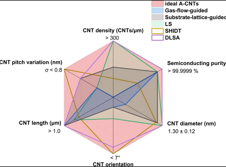 硅基商用晶體管尺寸的縮減伴隨著物理極限、功耗、成本等多重挑戰(zhàn)。新原理、新結構、新材料器件亟需引入,以滿足集成電路對集成度和算力的需求。半導體型陣列碳納米管(A-CNT)具有高載流子遷移率、超薄體、對稱的能帶結構,基于此材料制備出的互補金屬氧化物半導體場效應晶體管(CMOS FET)展示出幾乎對稱的電學性能(Science 368, 850, 2020; Nature Electronics 4, 405, 2021; ACS Nano 16, 21482, 2022),90 nm節(jié)點A-CNT FET的性能超越了硅基28 nm節(jié)點器件,并展現出進一步縮減至10 nm節(jié)點的潛力(Nature Electronics 6, 506-515, 2023),是構建未來集成電路的理想器件。實現碳基集成電路技術從原型器件到工程化集成的跨越,需要晶圓級高質量的半導體碳納米管材料。經過了30余年的發(fā)展,學術界已經發(fā)展了體系豐富的碳納米管材料制備技術,然而,目前電子級碳納米管材料,特別是A-CNT材料,一直缺乏具體要求和標準,在一定程度上阻礙了碳基集成電路的發(fā)展。