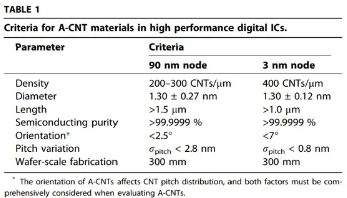 表 1:高性能集成電路用陣列碳納米管材料標準