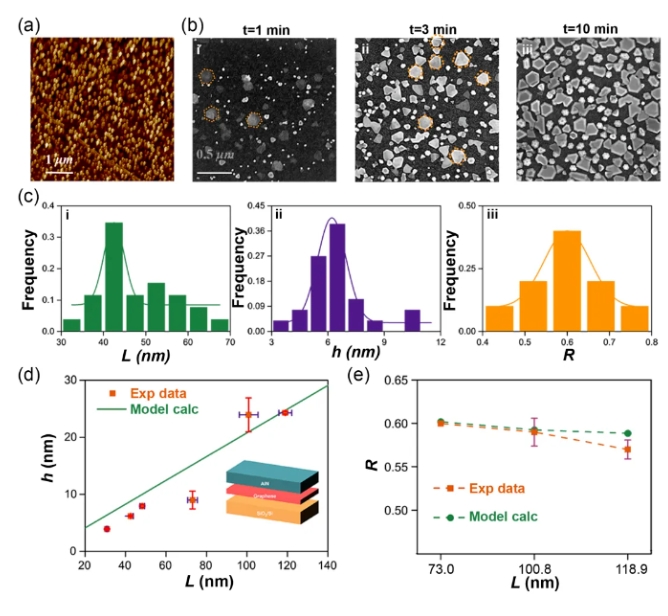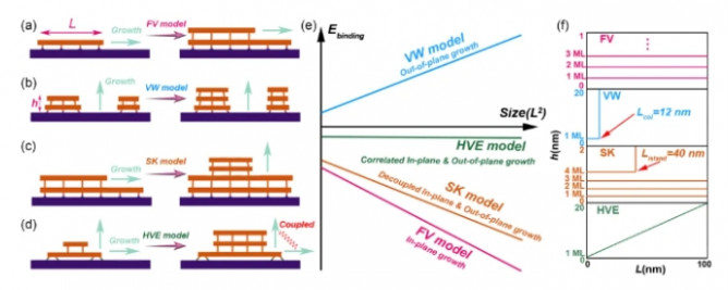 為揭開這一神秘的生長(zhǎng)機(jī)制,研究團(tuán)隊(duì)以氮化鋁薄膜生長(zhǎng)在石墨烯上為例,利用多尺度的理論計(jì)算和連續(xù)介質(zhì)模型推導(dǎo),系統(tǒng)研究了氮化鋁薄膜在平面內(nèi)(圖2)和垂直于平面方向(圖3)生長(zhǎng)動(dòng)力學(xué)過程。有趣的是,他們發(fā)現(xiàn)氮化鋁與石墨烯的界面存在一種新型的成鍵方式,即雜化范德華相互作用。這樣一種獨(dú)特的成鍵方式使得薄膜生長(zhǎng)呈現(xiàn)出顯著區(qū)別于傳統(tǒng)模式的新范式,被命名為HVE模型。在HVE模型下,材料平面內(nèi)和平面外的生長(zhǎng)會(huì)較強(qiáng)的耦合在一起,并滿足一定的物理約束條件,而這個(gè)約束條件也受到界面相互作用的影響。為了驗(yàn)證理論提出的這一新生長(zhǎng)模型的可靠性,北京大學(xué)楊學(xué)林研究員等進(jìn)行了實(shí)驗(yàn)驗(yàn)證,初步驗(yàn)證了該生長(zhǎng)模式的可靠性(圖4)。