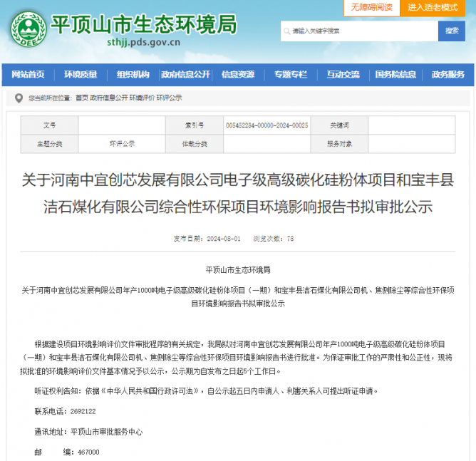 近日據(jù)平頂山市生態(tài)環(huán)境局官網(wǎng)消息,平頂山市生態(tài)環(huán)境局?jǐn)M對河南中宜創(chuàng)芯發(fā)展有限公司(以下簡稱:中宜創(chuàng)芯)年產(chǎn)1000噸電子級高級碳化硅粉體項目(一期)環(huán)境影響報告書進(jìn)行批準(zhǔn)。