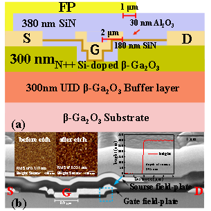 研究表明,器件的制備過(guò)程包括在柵下區(qū)域進(jìn)行低損傷刻蝕,刻蝕深度為295 nm。研究組采用分步刻蝕的方法,利用O2等離子體對(duì)器件的刻蝕損傷進(jìn)行修復(fù),氧等離子體在電離過(guò)程中產(chǎn)生大量的氧離子,而Ga2O3材料中存在的氧空位可以通過(guò)這些氧離子得到補(bǔ)充。AFM圖像顯示刻蝕前后材料表面粗糙度變化量小于0.15 nm,表明了刻蝕過(guò)程中引入了較低的損傷,降低了電離雜質(zhì)散射的影響,從而保證了器件具有較高的遷移率。