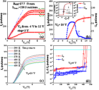 圖2 器件輸出特性、轉(zhuǎn)移特性、熱穩(wěn)定性及擊穿特性