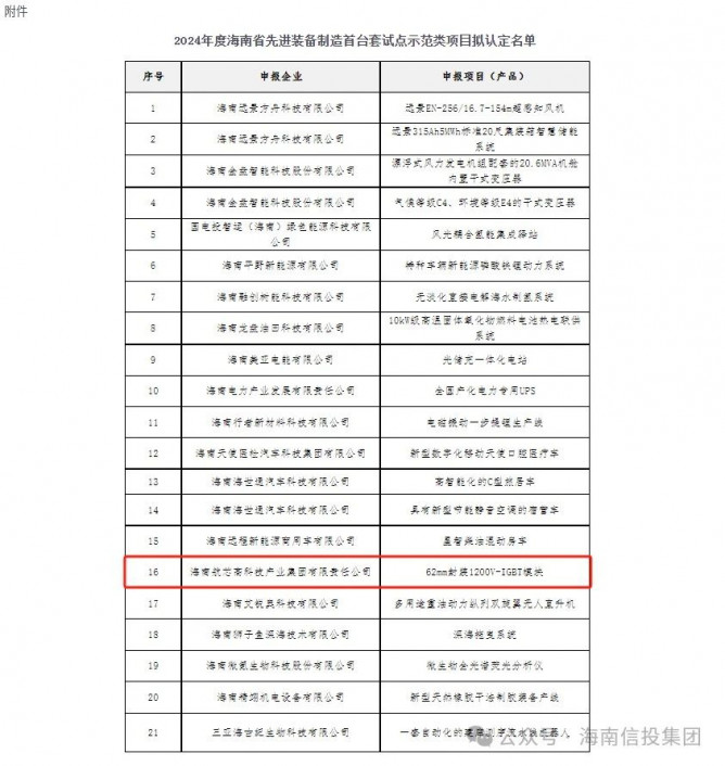 據(jù)海南信投集團(tuán)官微,8月26日海南省工業(yè)和信息化廳發(fā)布關(guān)于2024年度海南省先進(jìn)裝備制造首臺(tái)套試點(diǎn)示范類項(xiàng)目擬認(rèn)定名單,海南信投集團(tuán)投資企業(yè)海南航芯申報(bào)的62mm封裝1200V-IGBT模塊產(chǎn)品,經(jīng)市縣推薦、專家評(píng)審等工作流程,擬被認(rèn)定為2024年度海南省先進(jìn)裝備制造首臺(tái)套試點(diǎn)示范類項(xiàng)目。