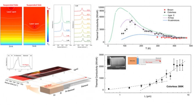 本研究探討了納米尺度下,單晶金剛石中的熱輸運(yùn)現(xiàn)象,提供了超薄結(jié)構(gòu)中二維聲子輸運(yùn)模式的新見解。研究團(tuán)隊(duì)將單晶金剛石減薄到幾十納米數(shù)量級(jí),并通過(guò)拉曼光譜監(jiān)測(cè)聲子能量變化。結(jié)果顯示,金剛石薄片的熱導(dǎo)率κ在溫度較高下遵循κ~1/T的衰減規(guī)律,與Debye-Callaway模型一致,表明存在Umklapp聲子散射。此外,熱導(dǎo)率與熱傳輸路徑尺度L之間遵循κ~log(L)的對(duì)數(shù)發(fā)散關(guān)系,符合Fermi-Pasta-Ulam模型的預(yù)測(cè),揭示了金剛石在納米尺度的二維聲子特性。特別是,超薄金剛石仍表現(xiàn)出優(yōu)異的面內(nèi)熱導(dǎo)率 (2000 W/mK),顯著高于大多數(shù)金屬和半導(dǎo)體。以上發(fā)現(xiàn)擴(kuò)展了對(duì)3D晶體在納米尺度能量輸運(yùn)的理解,同時(shí)表明超薄金剛石在芯片熱管理中的應(yīng)用前景。