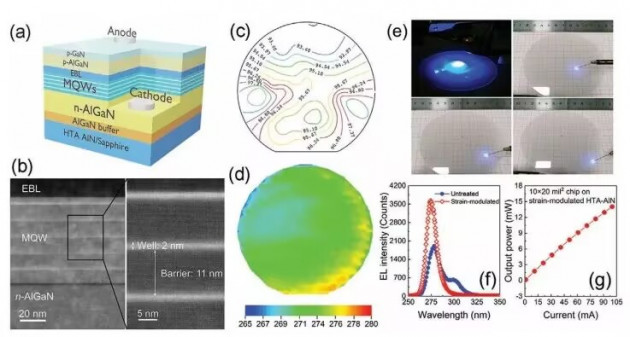 圖4.(彩色在線)a)在4英寸應(yīng)變改性HTA-AIN模板上通過MOCVD制備的UVC-LED結(jié)構(gòu)的示意圖;b)UVC-LED以及MQW區(qū)域的HAADFSTEM圖像,觀察到5周期MQW區(qū)域由2 nm厚的AIGaN威爾斯阱和11 nm厚的AIGaN勢(shì)壘組成;c)薄層電阻映射(單位:Ω/sq),d)PL波長映射(單位:nm)和e)應(yīng)變定制的HTA-AIN模板上的4英寸UVC-LED晶片的EL的照片;f)HTA-AIN模板上的倒裝芯片UVC-LED的波長相關(guān)EL和g)作為電流的函數(shù)的輸出功率。