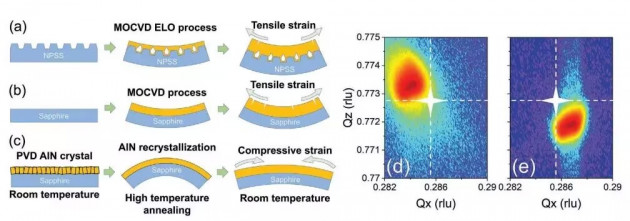 圖1.(Color onine)a)AIN/NPSS,B)AIN/平坦藍(lán)寶石襯底,c)HTA-AIN模板制備方案,呈現(xiàn)不同類型的內(nèi)應(yīng)力;d )AIN/NPSS和e)HTA-AIN(105)面RSM的X射線行射。無應(yīng)變(105)面AIN的衍射峰為星形。