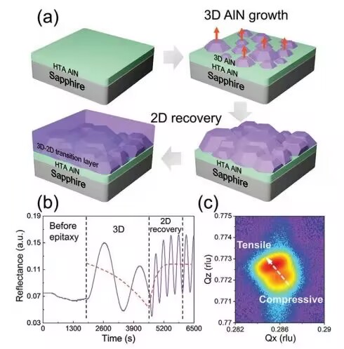 圖3.(彩色在線)a)示意圖和b)HTA-AIN上3D-2D過渡層生長過程的相應(yīng)原位405 nm反射率曲線。紅色虛線是眼睛捕捉反射率曲線的平均強(qiáng)度趨勢(shì)的指引。c)應(yīng)變剪裁HTA-AIN模板的X射線(105)面響應(yīng)面。應(yīng)變變化的痕跡由白色虛線箭頭標(biāo)記。
