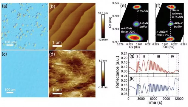 圖2.HTA AIN上的UVC-LED晶片的光學(xué)顯微鏡圖像a)沒有和c)具有3D-2D過渡層。在AIN再生長后的HTA-AIN的原子力顯微鏡圖像b)沒有和d)具有3D-2D過渡層。在HTA-AIN模板上的UVC-LED結(jié)構(gòu)的X射線(105)面RSM e)沒有和 f)具有3D-2D過渡層。行射圖案加寬通常被認(rèn)為是AIGaN層質(zhì)量的獨(dú)特參考。從n-AIGaN和AIN RSM的峰位置,弛豫比計(jì)算為30%和9%,在沒有和h)具有3D-2D過渡層的HTA-AIN上生長的UVC-LED的原位405nm反射率曲線。UVC-LED外延中相應(yīng)的不同階段用虛線標(biāo)記:區(qū)域I(AIN再生長)、區(qū)域II(AIGaN緩沖層)、區(qū)域III(n-AIGaN層)和區(qū)域IV(MQW和p型區(qū)域)。