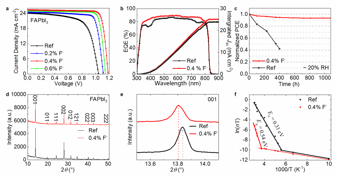 F−的強(qiáng)電負(fù)性顯著增強(qiáng)了CsPbI2Br中離子間的結(jié)合能,有效抑制了鈣鈦礦材料內(nèi)部缺陷的形成。值得注意的是,F(xiàn)−的引入并未在材料的能帶隙內(nèi)引入任何局部的淺或深能級缺陷態(tài)。微量的F−(0.2%)摻雜不僅能增大鈣鈦礦薄膜的晶粒尺寸,延長載流子壽命,改善表面疏水性,而且同時抑制了離子遷移和相分離現(xiàn)象,進(jìn)一步優(yōu)化了鈣鈦礦材料的電學(xué)性能和穩(wěn)定性。其摻雜的鈣鈦礦太陽電池的性能和穩(wěn)定性都得到了顯著提升。在標(biāo)準(zhǔn)太陽光AM 1.5G條件下,CsPbI2Br器件效率達(dá)到了17.78%,相較于未處理的鈣鈦礦器件顯著提高了22%。在室內(nèi)光照條件下,F(xiàn)−誘導(dǎo)的缺陷抑制對器件性能提升更為顯著,效率從30.43%提升至38.01%。該器件還展示出優(yōu)異的穩(wěn)定性,在∼20% RH儲存(或連續(xù)光照)條件下,經(jīng)過1000多個小時,仍能保持初始效率的98%(94%)。此外,F(xiàn)−也可以借助這種增溶性配體直接引入到有機(jī)-無機(jī)雜化鈣鈦礦晶格中,大大抑制了離子遷移并穩(wěn)定了晶相,從而獲得了高效穩(wěn)定的兩步法制備的FAPbI3器件,其效率達(dá)到了25.10%。這一成果標(biāo)志著首次在一般鈣鈦礦薄膜晶格中實(shí)現(xiàn)F−的直接引入,為提升鈣鈦礦器件的性能與穩(wěn)定性開辟了新的技術(shù)途徑和方法。