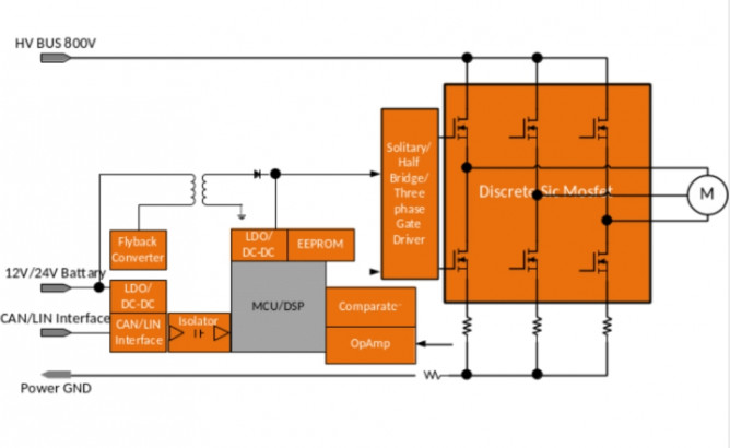 電動壓縮機控制器功能包括:驅(qū)動電機(逆變電路:包括ASPM模塊或者分立器件搭載門極驅(qū)動,電壓/電流/溫度檢測及保護,電源轉(zhuǎn)換),與主機通訊(CAN或者LIN ,接收啟停和轉(zhuǎn)速信號,發(fā)送運行狀態(tài)和故障信號)等,安森美(onsemi)在每個電路中都有相應的解決方案(圖1)。上一章,我們探討了安森美ASPM模塊方案在電動壓縮機上的應用,本文主要討論SiC MOSFET 分立方案。
