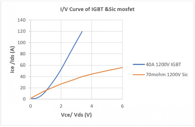 以安森美適用于800V平臺電動壓縮機應用的最新一代IGBTAFGHL40T120RWD和SiC MOSEFT NVHL070N120M3S為例,根據(jù)I/V曲線來評估開通損耗, 在電流小于18A時,SiC MOSEFT的導通壓降都是小于IGBT的,而電動壓縮機在路上行駛過程中,運行電流會一直處于18A區(qū)間以內(nèi)。即使是在極限電流下運行(比如快充時,壓縮機給電池散熱),有效值接近20A,在電流的整個正弦波周期內(nèi),SiC MOSEFT的開通損耗也不比IGBT差。