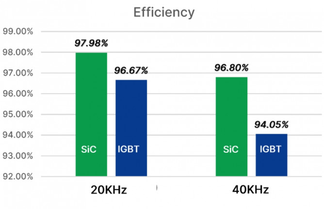 我們使用相近電流規(guī)格的IGBT和SiC MOSEFT做了效率仿真,在最大功率下,SiC也可以有效提高系統(tǒng)效率,尤其在高頻應用中更加明顯。
