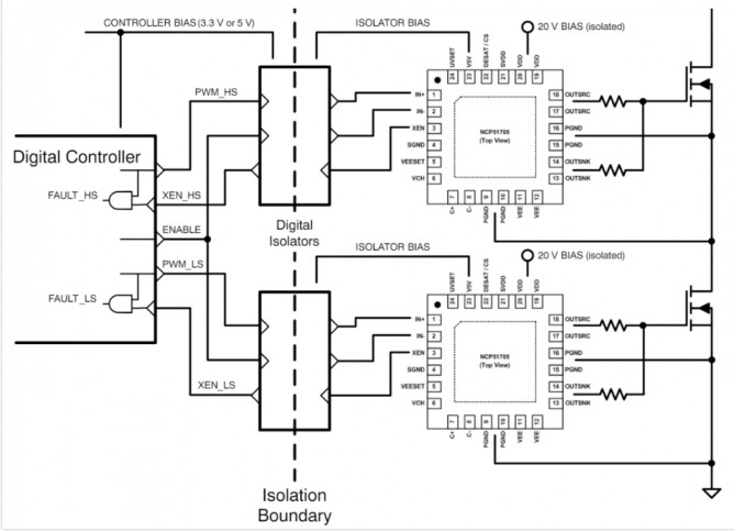 在電動壓縮機應用中,需要應對下橋和三路上橋的電源需求,增加負電源并不容易。針對這種情況,推薦使用自身可產(chǎn)生負壓,帶有desat保護,欠電壓保護UVLO以及過熱保護功能的專用SiC MOSEFT驅(qū)動芯片NCV51705。
