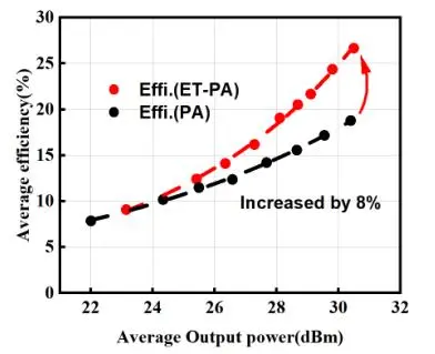 圖3 包絡(luò)跟蹤功率放大器效率提升曲線(對比F類功率放大器)