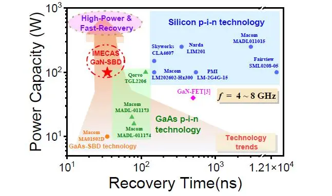 在限幅器方向,團隊采用全GaN SBD-MMIC技術(shù)的限幅器, 利用全GaN肖特基勢壘二極管來實現(xiàn)的單片微波集成電路(全GaN SBD-MMIC)技術(shù),研制的限幅器顯示出高在連續(xù)波模式(CW)下,入射功率超過50W脈沖模式下為125 W,插入損耗(IL)小于1dB@8GHz,具備39納秒的創(chuàng)紀(jì)錄的快速恢復(fù)時間,拓展了寬禁帶材料在GaN SBD的限幅器領(lǐng)域的應(yīng)用前景。