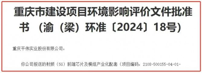 10月8日,重慶平偉實業(yè)官微消息,公司成功獲得重慶市建設(shè)項目環(huán)境影響評價文件的批準(zhǔn)。