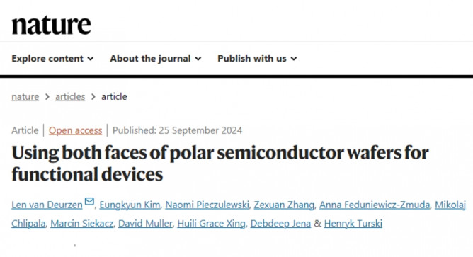 為了解決這些問(wèn)題,康奈爾大學(xué)Huili Grace Xing和Debdeep Jena團(tuán)隊(duì)在Nature期刊上發(fā)表了題為“Using both faces of polar semiconductor wafers for functional devices”的最新論文。研究人員提出了一種新型的雙電子集成方案,該方案利用GaN基材的N極面和金屬極面分別制作HEMT和LED。這一方法避免了需要選擇性去除或再生長(zhǎng)外延層的復(fù)雜過(guò)程,從而降低了對(duì)材料界面質(zhì)量的要求,顯著提高了器件的性能。具體而言,該研究通過(guò)精確控制器件結(jié)構(gòu)中的電流和光發(fā)射,實(shí)現(xiàn)了HEMT-LED的高效開(kāi)關(guān),展示了其在光電集成電路中的潛力。