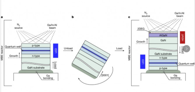 圖1 | HEMT-LED的等離子體輔助分子束外延生長(zhǎng)示意圖。