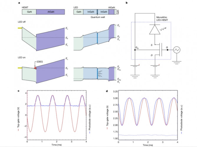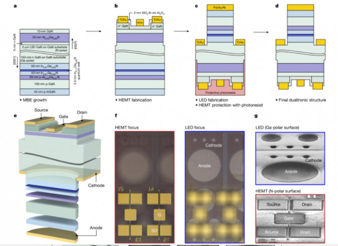 1. 實(shí)驗(yàn)首次實(shí)現(xiàn)了單片集成的高電子遷移率晶體管(HEMT)與發(fā)光二極管(LED),展示了雙電子光子器件的可行性。